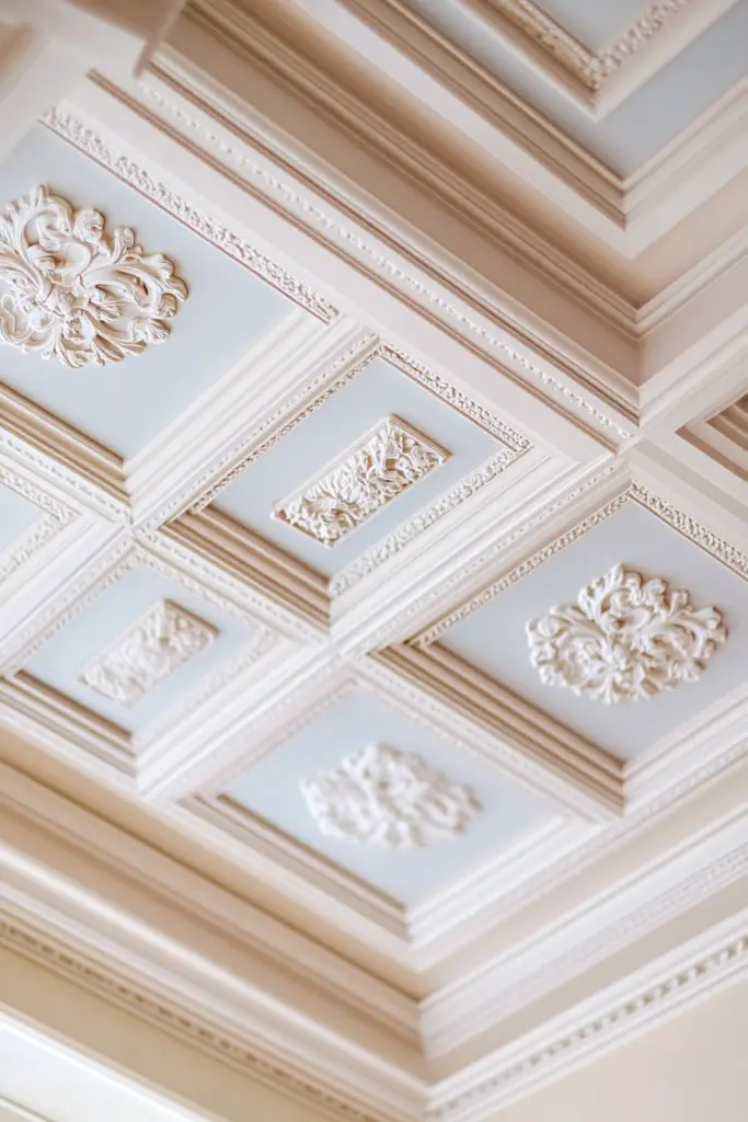 Want a ceiling that whispers luxury without shouting? Ornate coffers with delicate molding and a soft color palette create a refined, artistic atmosphere. They add a layer of sophistication that elevates any room. If you’re aiming for understated elegance, this design is your new best friend.