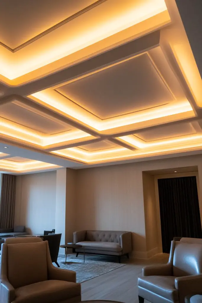 Visualize a ceiling where each coffer is edged with hidden LED strips, casting a soft, diffused light downward. The light accentuates the geometric pattern, adding depth and a contemporary vibe. Shadows and highlights dance across the panels, creating a dynamic visual effect. The room feels brighter and more inviting, perfect for entertaining or relaxing.