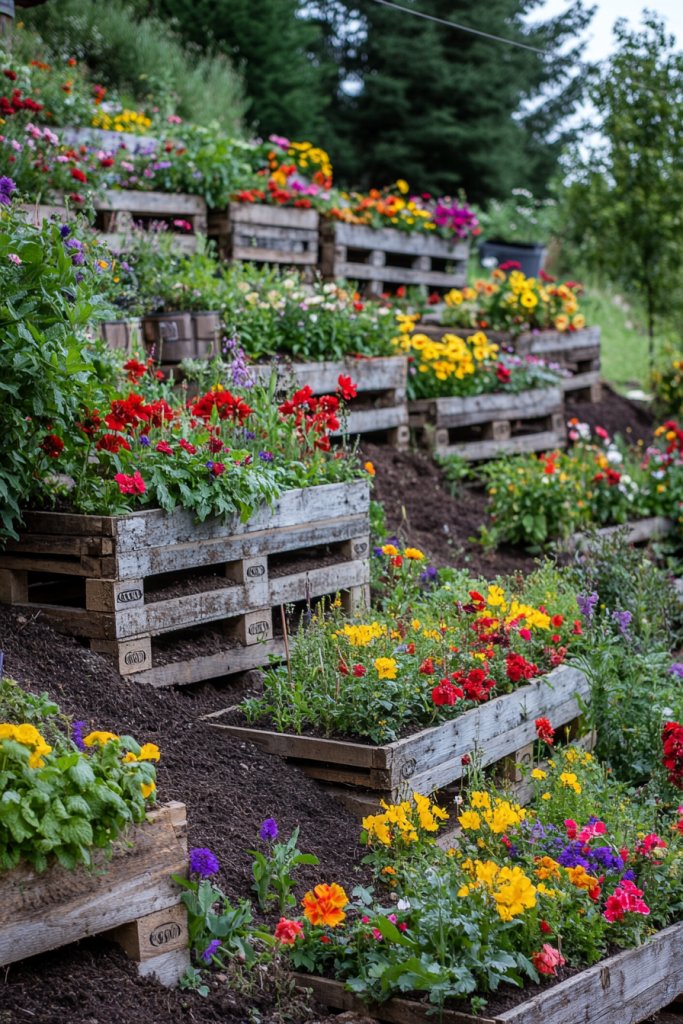 Picture a series of staggered, rustic flower beds built from weathered pallets stacked neatly along the slope. Bright blooms like petunias, marigolds, and zinnias cascade down each layer, creating a lively tapestry of reds, yellows, and purples. The rough wood contrasts beautifully with soft, lush greenery and pops of colorful blossoms. As you walk by, you feel enveloped in a cozy, garden-inspired retreat.