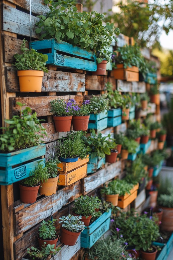 Picture a wall lined with painted wooden crates or repurposed pallets, stacked or hung with care. Inside each crate, you fill small pots or pockets with herbs, succulents, or flowering plants—nothing fancy, just functional and pretty. The vibrant greens pop against the weathered wood, creating a lively canvas of nature. The scent of herbs and the sight of tiny blooms add to the sensory experience.