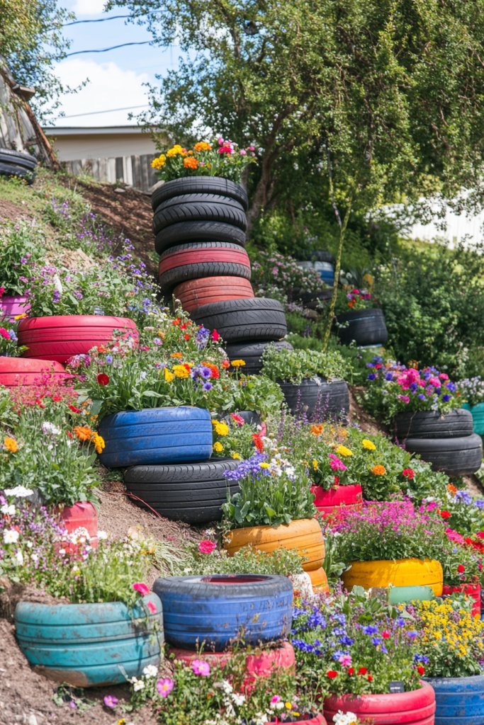 Imagine bright, painted tires stacked or hung vertically, each filled with cheerful flowers or cascading greenery. The bold colors pop against the landscape, creating a lively, eye-catching display. Some tires are stacked to form small sculptures, or hung on fences or trees, adding height and dimension. The quirky look invites smiles and curiosity.