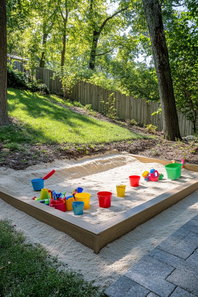 Want to keep the kids entertained outdoors without sacrificing your yard’s aesthetics? A simple sand or gravel play zone is an affordable, low-maintenance solution. It creates a designated area for fun while keeping the rest of your yard tidy. Plus, it’s a safe spot where children can be active and imaginative.