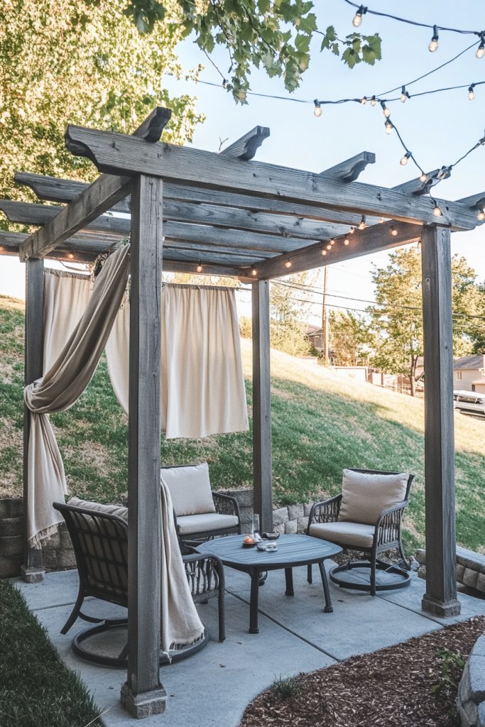 Picture a simple open-frame pergola with weathered beams and posts, draped with hanging fabric or climbing vines (if you’re into plants, which we said to avoid, so think textiles). The structure casts dappled shade over a seating or dining area, making it perfect for sunny afternoons. String lights or lanterns hang overhead, creating a cozy, inviting atmosphere.