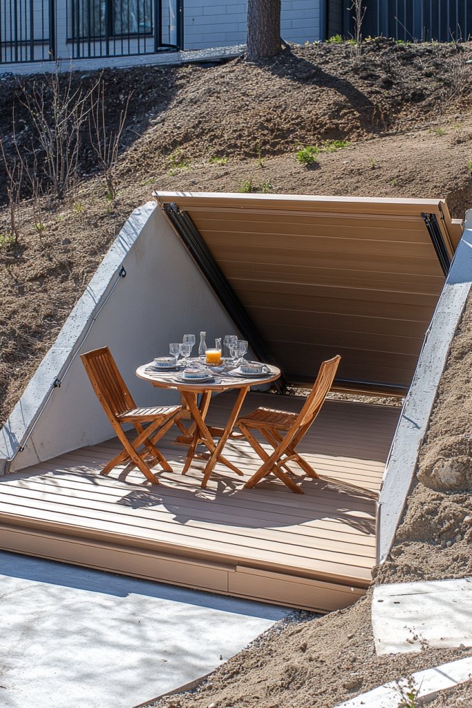 Imagine a simple platform made from pallets or reclaimed wood that folds out over your slope. When open, it’s a sturdy surface perfect for a table and chairs, with a textured outdoor rug underneath. When not needed, it folds or collapses into a compact stack, hiding away neatly. The setup creates a multi-functional area that’s both practical and stylish.