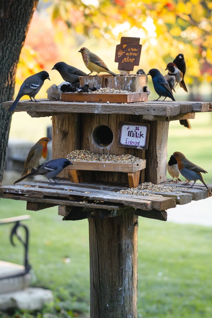 Imagine a small, rustic platform made from reclaimed wood or an old pallet, perched on a sturdy pole or hung from a tree. Birds of all colors and sizes flock to the feeder, pecking at seeds or suet. Nearby, a handmade perch or tray invites them to rest, while a decorative element like a painted sign or small sculpture adds personality. The scene is lively, cheerful, and full of motion.
