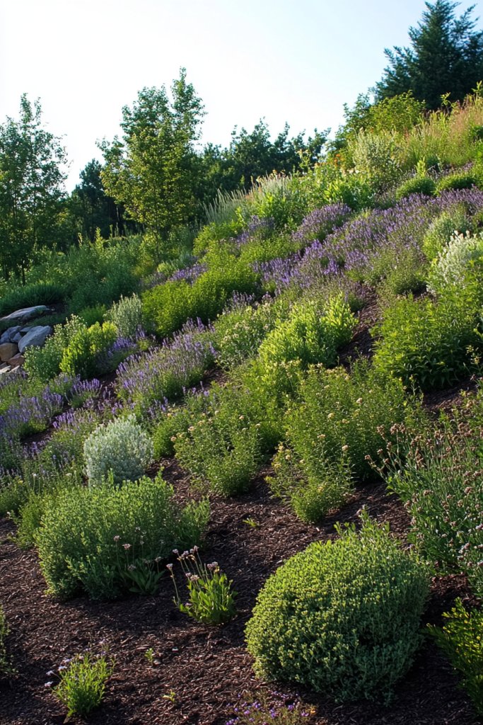 Visualize a blanket of dense, green creeping thyme, clover, or sedum spreading across the slope. Small flowers peek through, adding pops of color—pink, white, or yellow—while the textured foliage softens the harsh lines of the slope. The plants ripple with the breeze, creating a natural, living tapestry that’s both beautiful and functional.