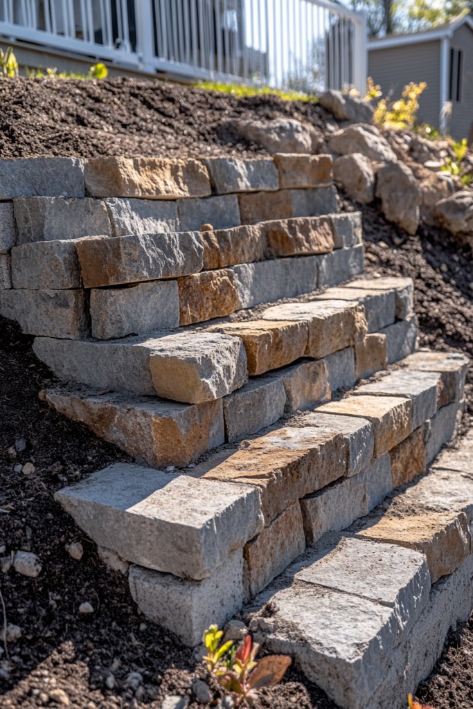Start by assessing your slope and marking the area. Dig a trench for the base to ensure stability. Lay a foundation of gravel or crushed stone to improve drainage. Stack the stones or cinder blocks, staggering joints for strength. Backfill with soil behind the wall and secure loose stones as needed. Use mortar or adhesive only if you want extra stability, but it’s not essential for a rustic look.