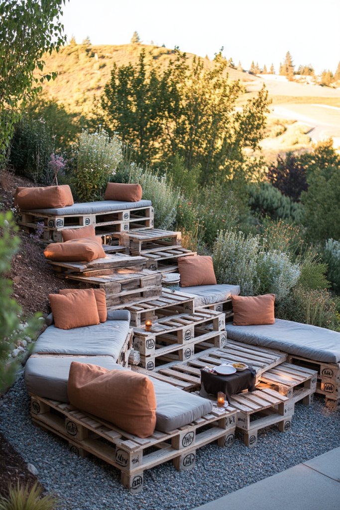 Imagine a series of stacked pallets forming different levels—like a small amphitheater—complete with cushions and throws. The top level serves as a dining nook, while lower tiers become lounge spots. Bright, patterned fabrics and textured cushions make it inviting. Surround the area with string lights or lanterns for a warm glow after sunset, transforming your yard into a cozy retreat.