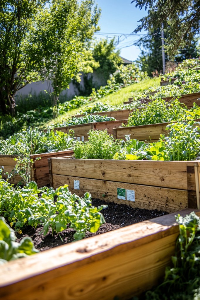 Imagine a series of neat, wooden boxes filled with lush greenery—tomatoes, basil, lettuce, and peppers—lining the slope. The raised beds are painted in cheerful colors or left natural, with mulch or straw on top to keep weeds at bay. Small pathways between beds invite you to stroll and harvest at will. The vibrant greens and reds pop against the rustic backdrop of your yard.