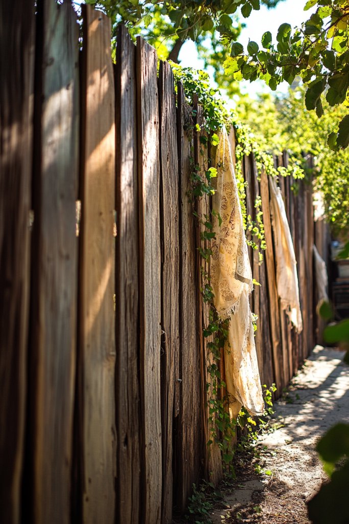 Imagine a tall, uneven fence made from weathered, mismatched planks nailed together with care. The wood’s natural patina adds character, while sparse gaps let dappled sunlight filter through. Climbing vines or decorative fabric can soften the barrier, creating a cozy, secluded nook. The overall effect is warm, inviting, and perfectly imperfect.