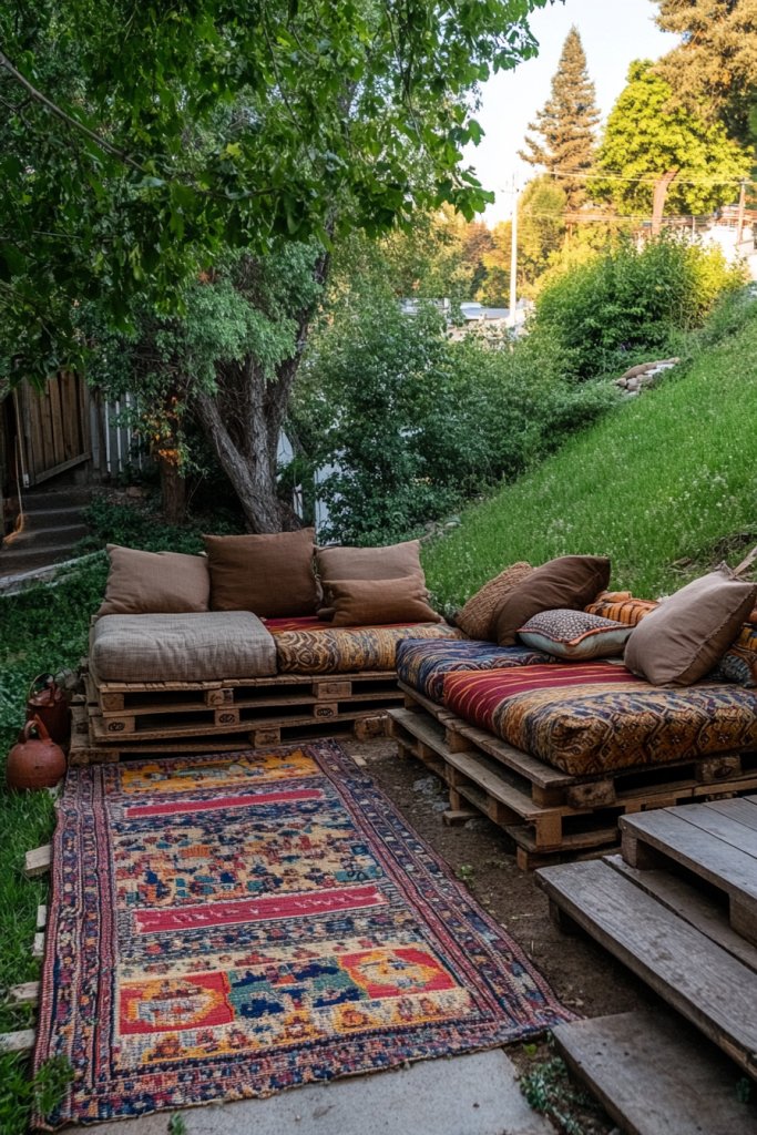 Picture a low, layered seating area made from pallets or old crates, topped with colorful cushions and textured rugs. String lights or solar lanterns hang overhead, casting a warm glow. The area feels inviting and relaxed, perfect for chatting or reading a book. The mix of textiles and natural elements creates a laid-back yet stylish vibe.