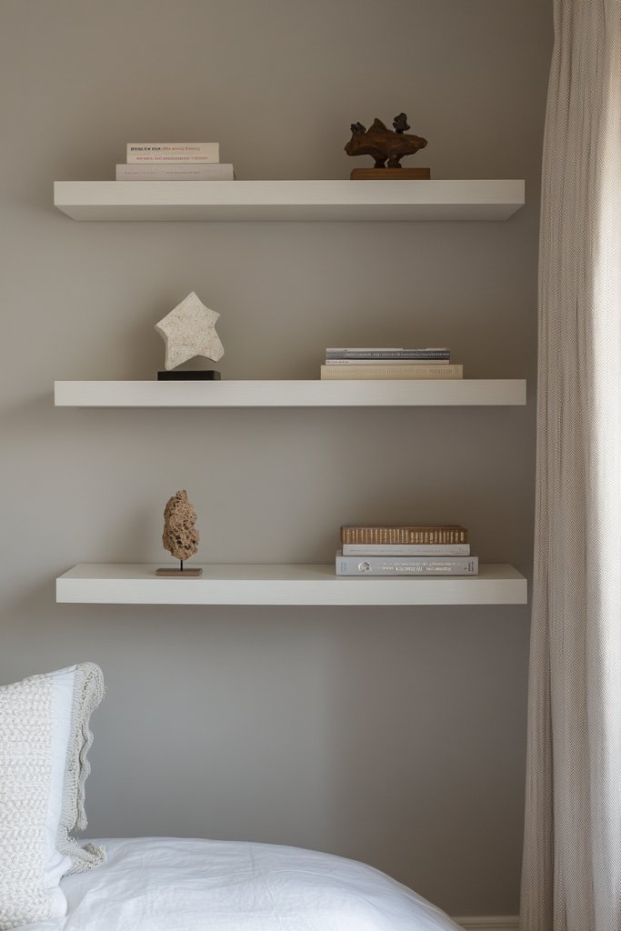 Imagine sleek, minimalist floating shelves mounted high on your walls, holding books, accessories, or decorative boxes. The shelves are finished in matte black or warm wood tones, adding a touch of modern elegance. Light bounces off the surfaces, making the room feel more open and airy. These shelves create a visual lift, drawing the eye upward and freeing up floor space.
