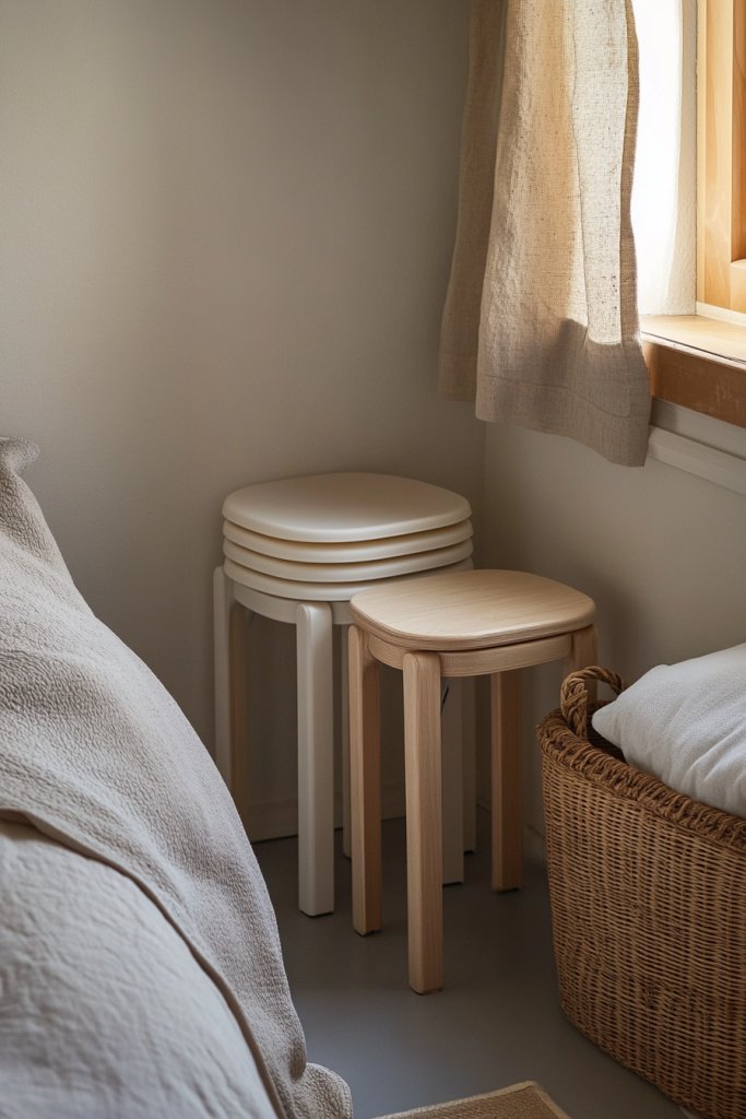 Visualize a set of sleek, lightweight stools stacked neatly in a corner. When guests arrive or you need extra seating, just pull them out and stack as needed. The stools are made of durable plastic or wood with minimalist designs, blending into your decor seamlessly. Their slim profile makes the room look more spacious and uncluttered.