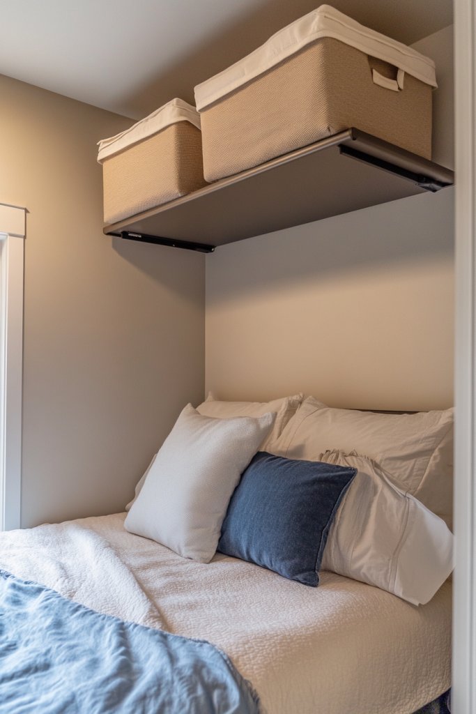 Imagine sleek, industrial-style racks installed high on the ceiling, holding seasonal or rarely used items. The racks are sturdy but discreet, blending seamlessly into the room’s design. Items are neatly stored in labeled bins or boxes, leaving your floor clear and your space feeling open and airy. It’s like having a secret attic just above eye level.
