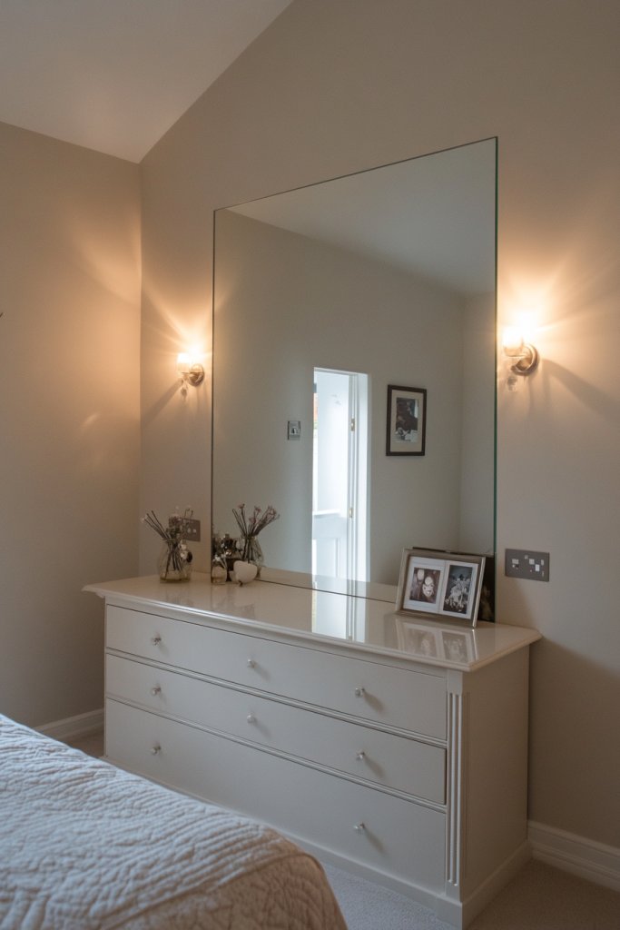 Decorate the edges with LED backlighting or attach decorative borders for added flair. Incorporate small hooks or shelves near the mirror for accessories or personal items. Use mirrored furniture pieces, like a side table or dresser, to amplify the effect. Personal touches make your space uniquely yours while enhancing its size.