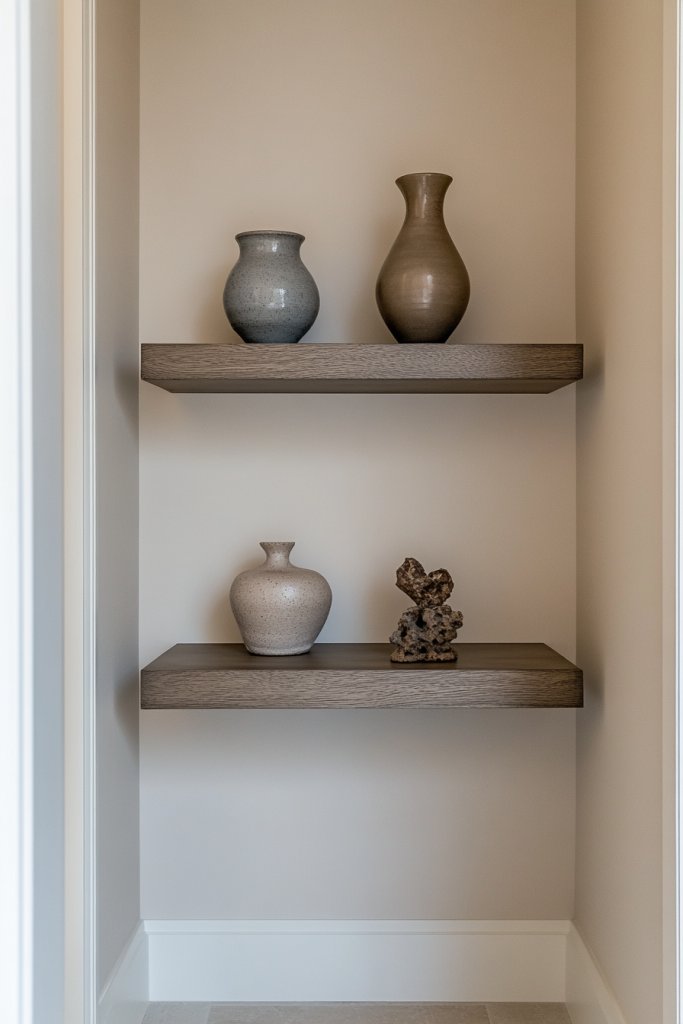 Imagine a floating wood shelf in a warm oak finish mounted above a narrow console. A small potted plant, a stack of books, and a decorative bowl sit atop, adding texture and color. The shelf’s clean lines and minimalist design keep the space open and airy. Soft lighting from a nearby sconce highlights the display, creating visual interest.