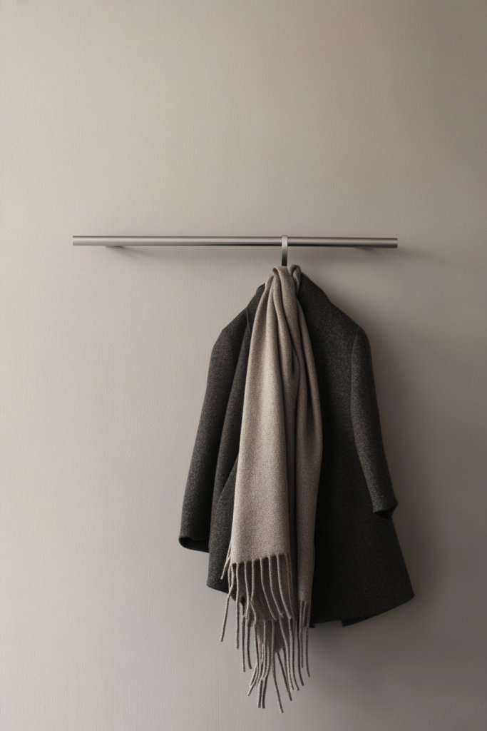 Picture a sleek matte black metal rail with evenly spaced hooks mounted just below a textured white wall. Coats and jackets hang neatly, with some lightweight scarves draped over the hooks. The clean, uncluttered design complements modern or Scandinavian decor. A small, decorative cushion on a nearby bench adds softness to the space.