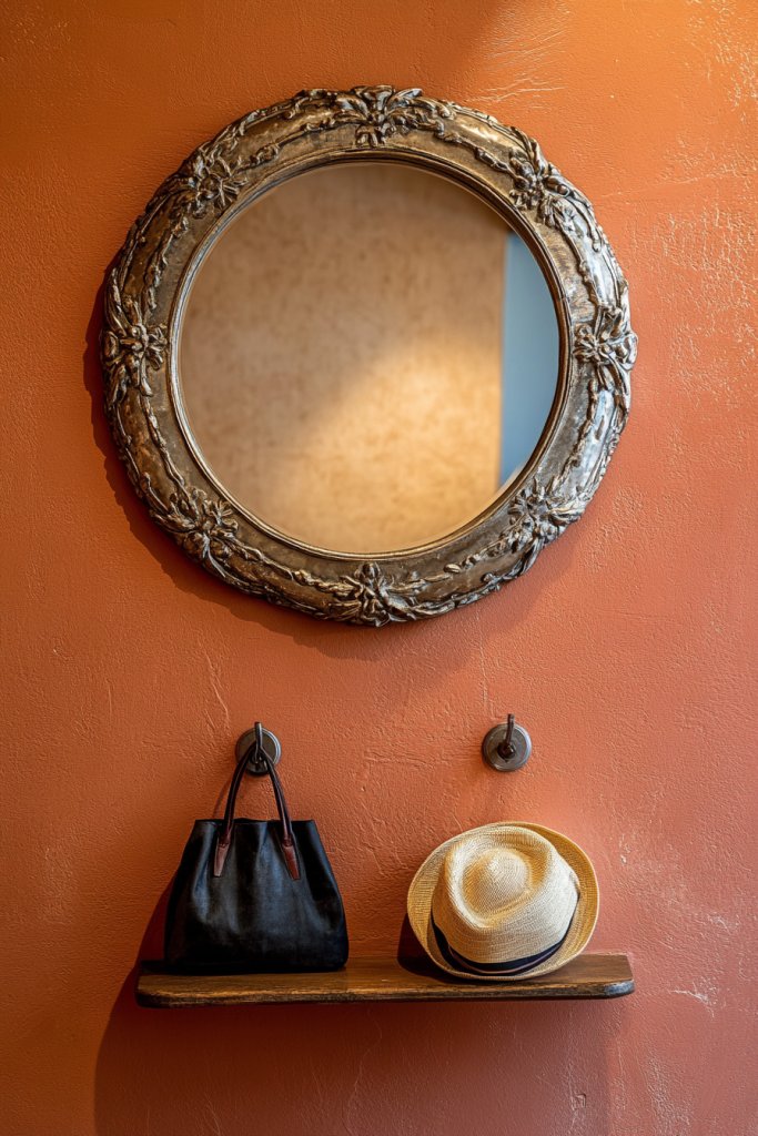 Imagine an ornate vintage mirror with a distressed frame hung above a small wooden bench. Beneath, a row of decorative hooks holds hats, umbrellas, and bags. The mirror’s reflective surface brightens the space, while the hooks keep everything organized. Soft light from a nearby fixture highlights the intricate details, creating a cozy, welcoming vibe.