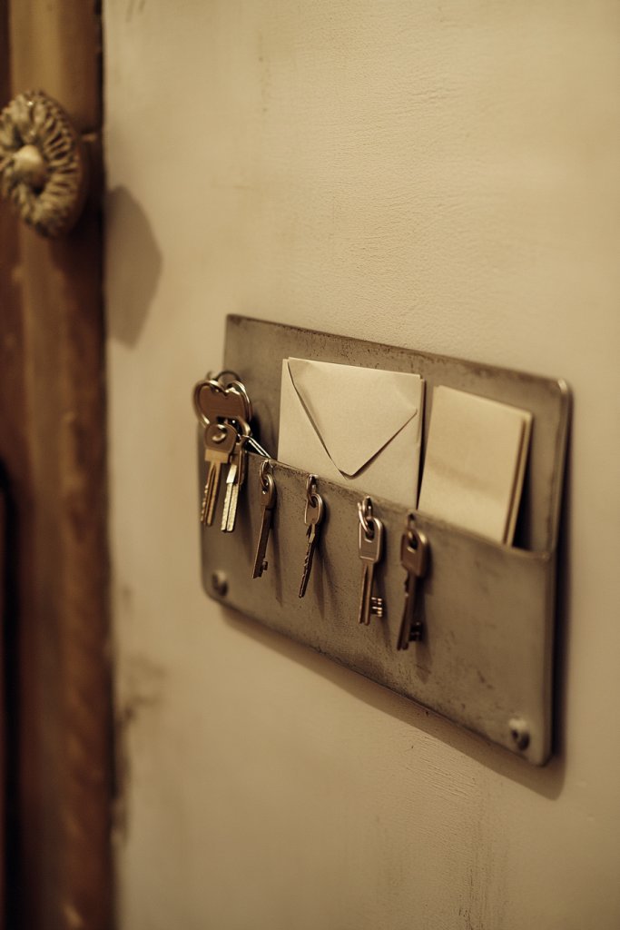 Imagine a sleek, black metal organizer with hooks for keys and a small slot for incoming mail, mounted above a narrow console. The minimalist design complements a modern entry, while a few decorative labels add charm. The organizer keeps everyday essentials within arm’s reach, reducing chaos and stress. The clean lines and functional layout make a statement.