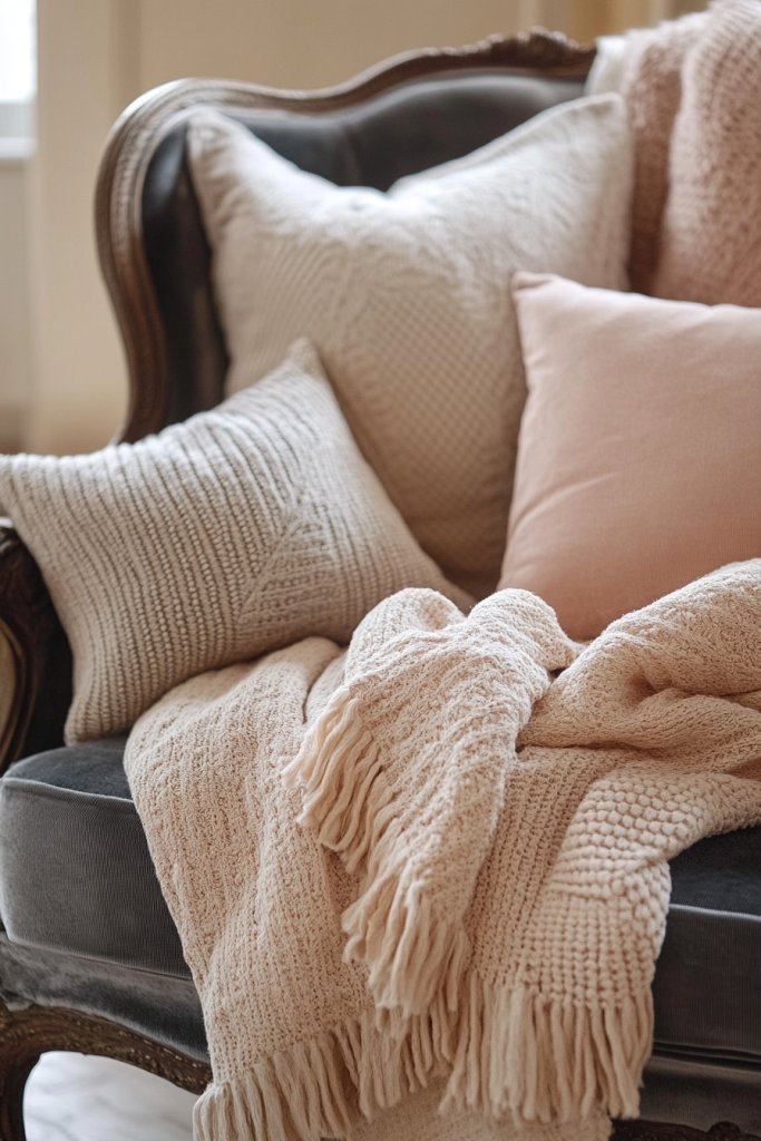 Picture a soft cream throw blanket with chunky knit texture draped over a sofa, paired with velvet cushions in rich jewel tones. The layered textiles create visual interest and tactile richness, inviting touch and relaxation. The combination of patterns and textures transforms a plain room into a cozy retreat. It’s like wrapping your space in a warm hug.