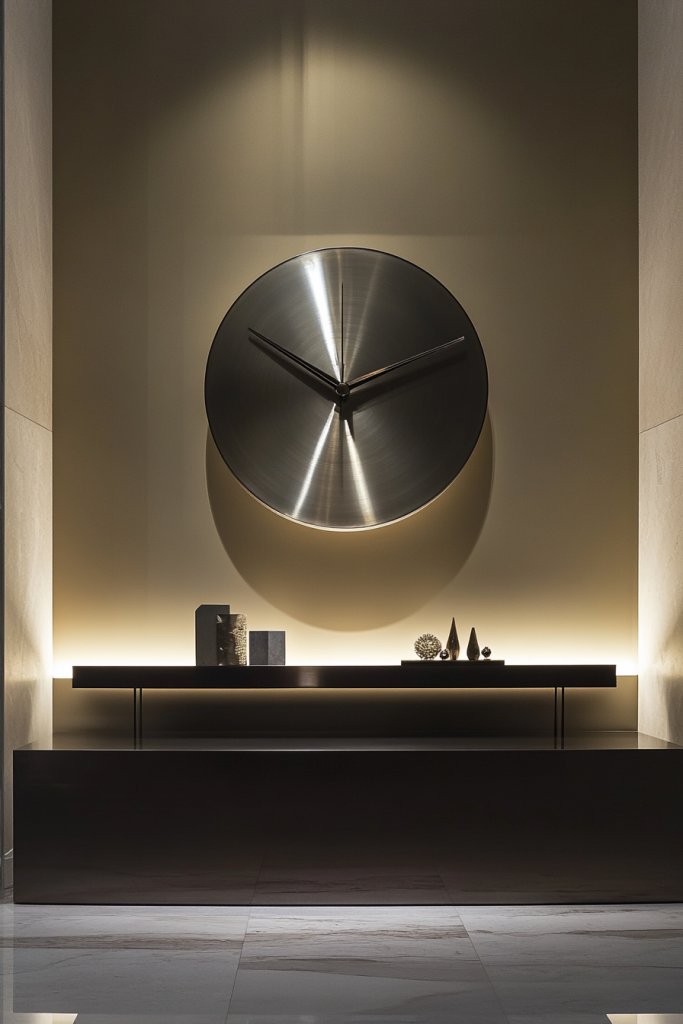 Imagine a large, modern clock with bold numbers as the centerpiece above your fireplace or sofa. Or visualize a minimalist shelf displaying a few curated objects—books, plants, or decorative boxes. The clock or shelf adds visual weight and anchors your space. It’s like jewelry for your walls.