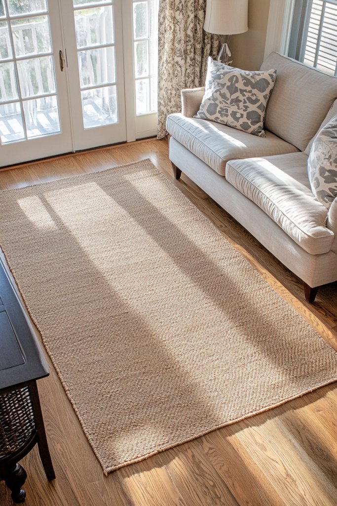 Layer your rug with textiles like throws or cushions that pick up its colors for a harmonious look. Use different textures—jute, wool, synthetic—to add depth. Personalize by adding decorative trims or fringe. Switch out rugs seasonally to keep your space feeling fresh and aligned with your style.