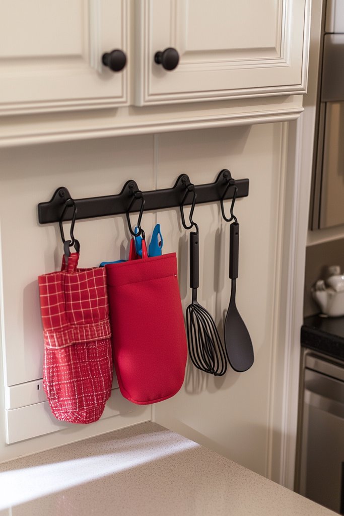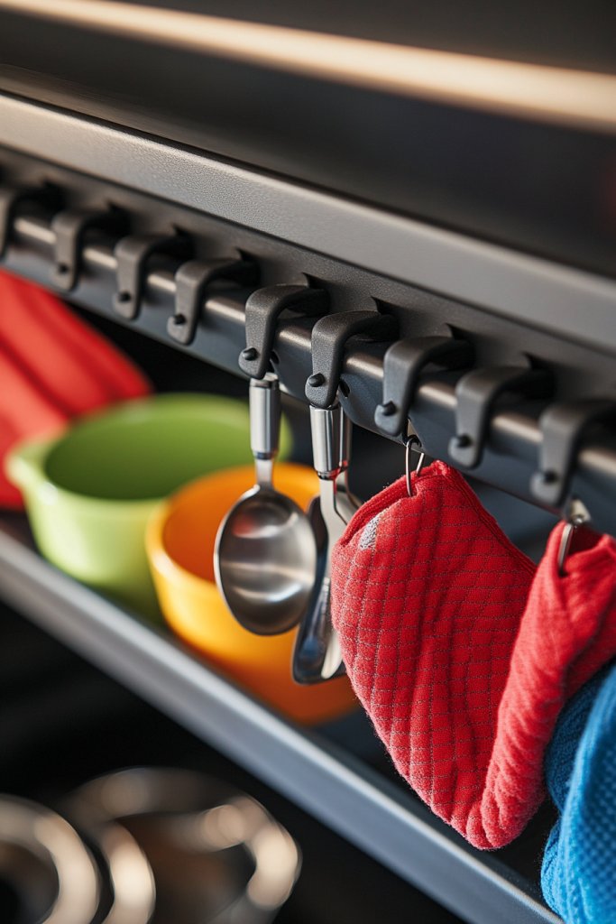 Visualize a row of hooks neatly hanging measuring spoons, oven mitts, and small pots just below a shelf. The hooks are unobtrusive and blend with your decor, providing a clean look. Items hang in an organized, accessible manner, freeing up drawers and counters. This setup turns vertical space into a quick-access storage zone, making your kitchen more efficient.