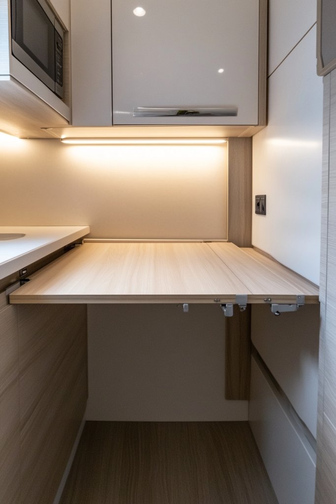 Imagine a sleek countertop with a hinged section that folds down easily, revealing a sturdy surface ready for chopping, eating, or working. When you’re done, simply lift or fold it away, leaving a smooth surface. The table’s minimal profile blends seamlessly into your kitchen, maintaining a clean aesthetic. It’s like having a secret extension that’s both functional and unobtrusive.
