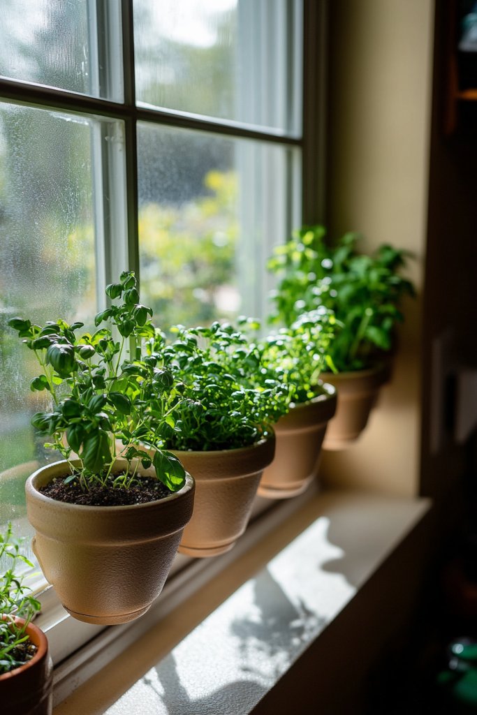 Envision a series of small, colorful pots or wall-mounted planters filled with basil, parsley, and mint, arranged vertically beside your window. The green leaves contrast beautifully against the wall or window frame, bringing a burst of nature into your kitchen. The plants sway gently with the breeze, filling the space with a fresh aroma. Easy to reach, they turn your cooking into a mini garden adventure.