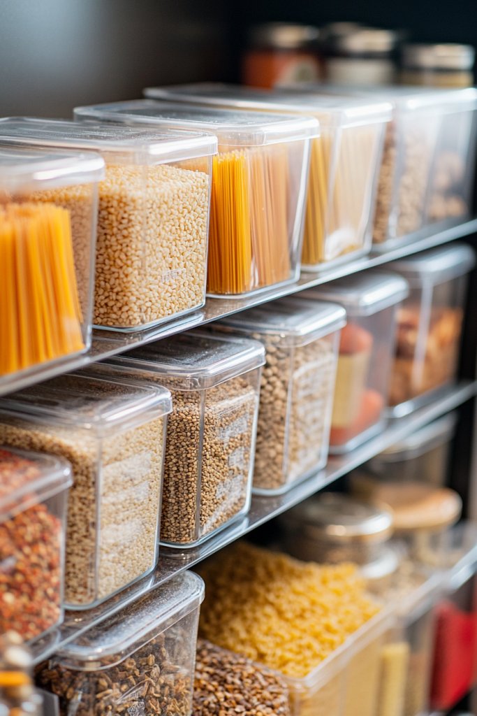 Picture a row of transparent, airtight containers stacked neatly on your shelves—each labeled with handwritten tags or sleek modern fonts. You see bright white rice, vibrant red lentils, and a jar of crunchy cereal, all easily visible. The clear plastic or glass catches the light, making your pantry look clean and inviting. As you reach for ingredients, you don’t have to rummage; everything is right there, organized and appealing.