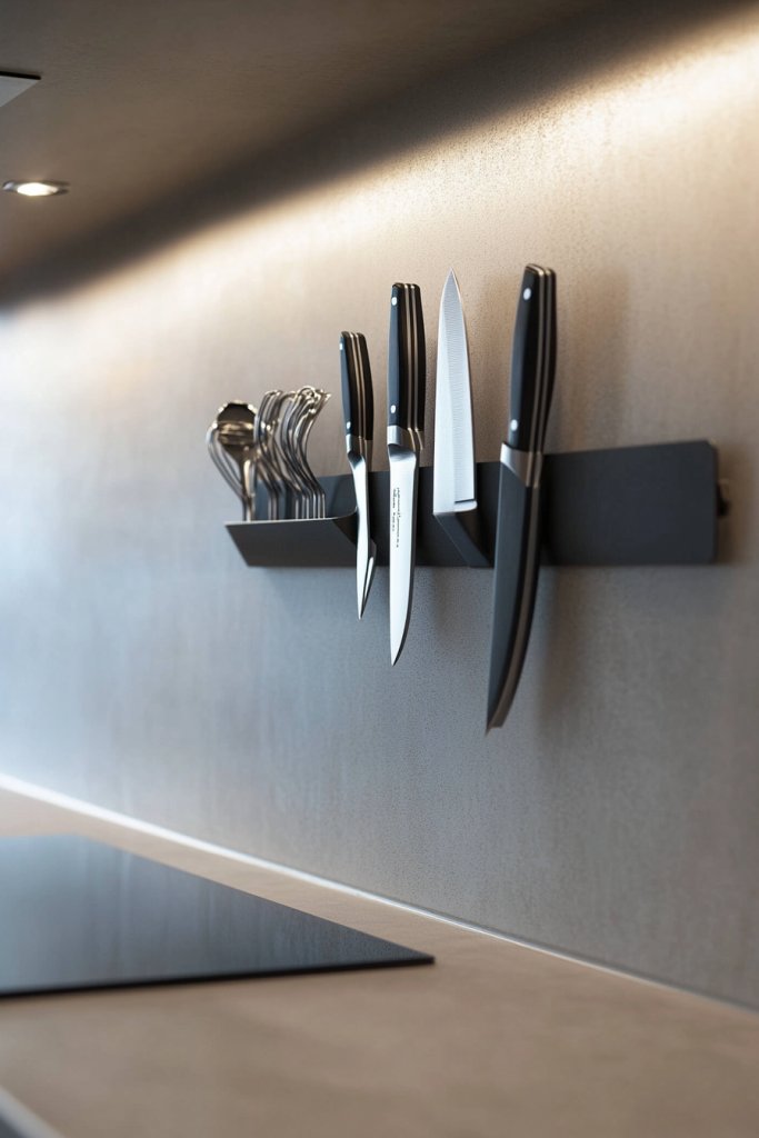 Imagine a simple metal strip mounted on the backsplash, with shiny knives and utensils standing upright like soldiers ready for action. The magnetic grip holds each tool securely, preventing accidental slips. The silver contrast of the strip against a colorful tile wall adds a modern, industrial vibe. When you need a knife, just grab it—no more rummaging or jamming your hand into a cluttered drawer. It’s a clean, efficient look that feels both functional and stylish.