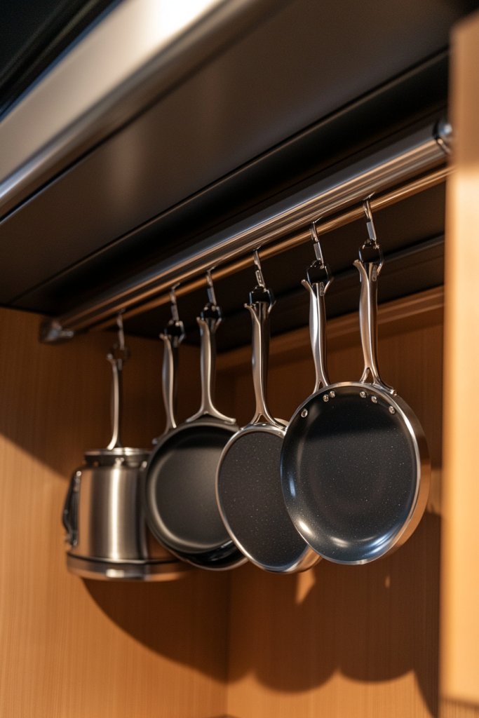 Picture a sleek, black metal rail mounted just below your ceiling, with hooks holding shiny stainless steel pots and pans. The cookware hangs in a tiered arrangement, creating a cascading effect that’s both beautiful and functional. The open display reveals your collection, turning your kitchen into a culinary showcase. The space underneath remains clear for prep work, making cooking more efficient.
