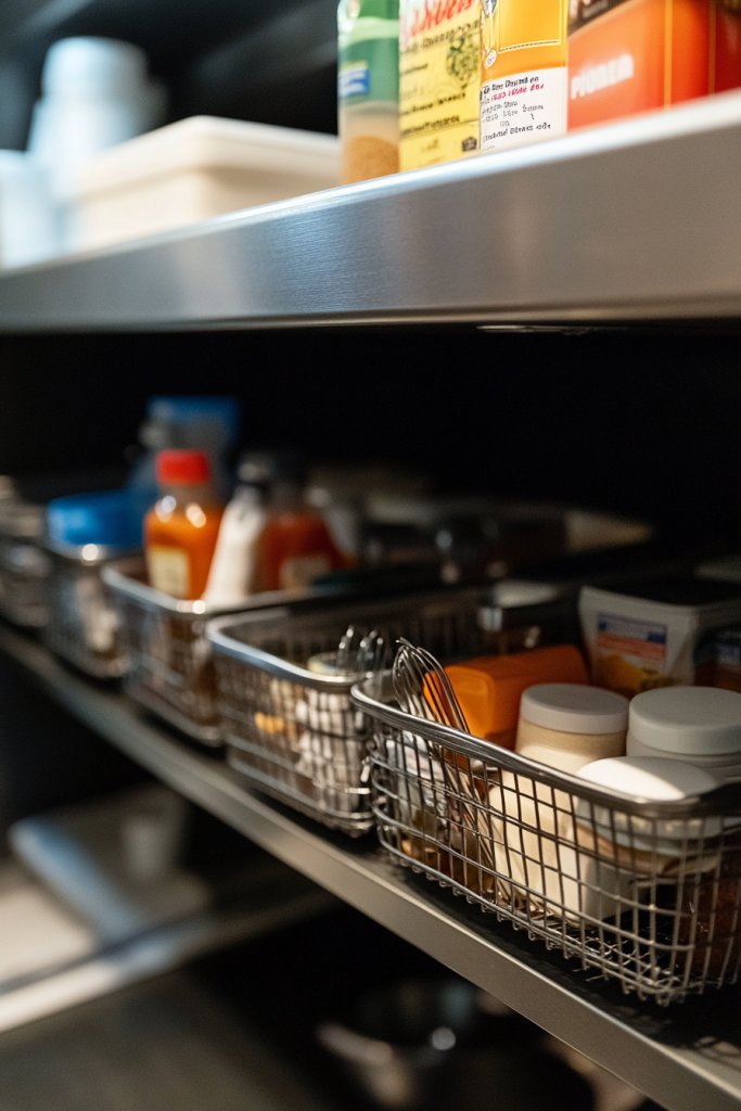 Choose baskets in metal, plastic, or coated finishes to match your decor. Size options vary from small compartments for spices to larger baskets for cleaning supplies. Use color coding or labels to distinguish categories easily. For seasonal needs, swap out baskets or contents to keep your system flexible. This method works well in both open shelving and inside cabinets with exposed edges.