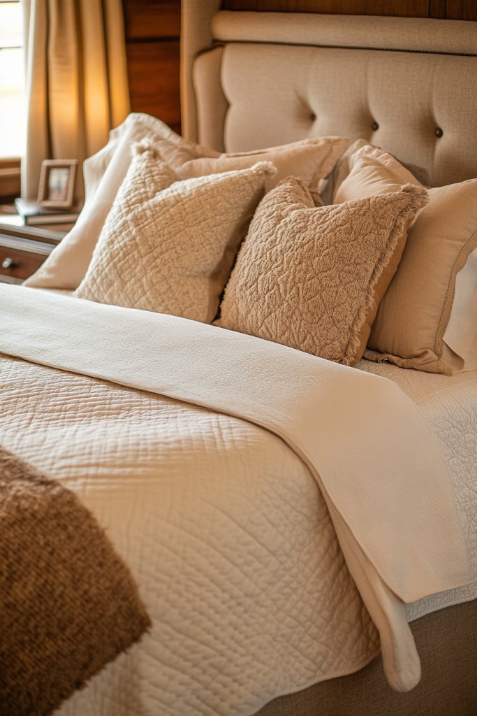 1. Use Soft, Layered Bedding in Warm Neutrals to Create a Inviting Atmosphere