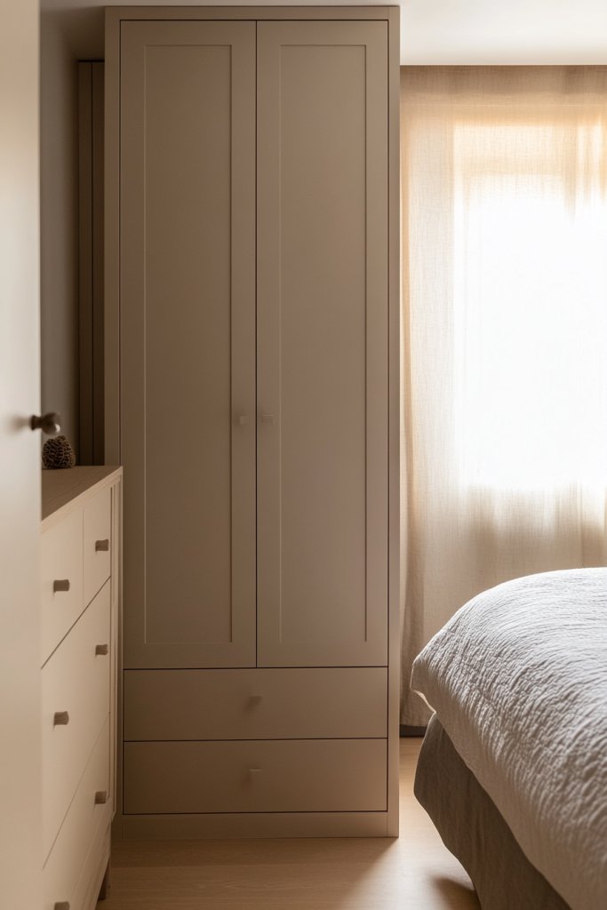 Imagine a narrow, tall dresser reaching almost to the ceiling, painted in a neutral hue that blends with the walls. The vertical design provides ample storage without sacrificing floor space. Alternatively, wall-mounted cabinets or open shelving units hold clothing, accessories, or daily essentials in a sleek, organized manner. The room appears taller and more spacious, with everything neatly tucked away.