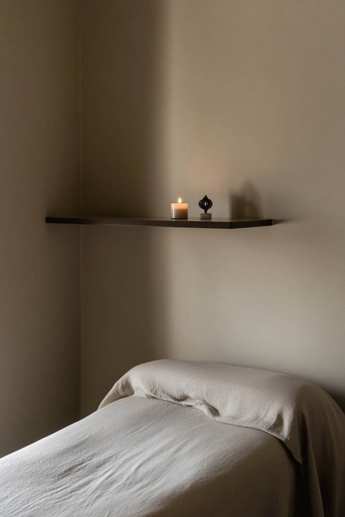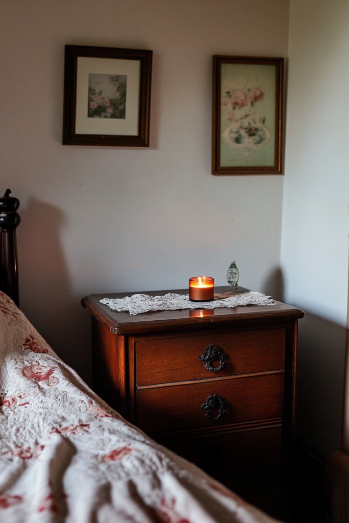 Visualize a floating shelf holding a collection of vintage cameras, small sculptures, or framed photos—each piece telling a story. The items are carefully curated to avoid clutter while adding personality. A bedside table displays a favorite book, a cozy candle, or a small cherished object. The curated display creates a warm, inviting vibe that feels authentic and personal. It’s as if your room whispers your story.