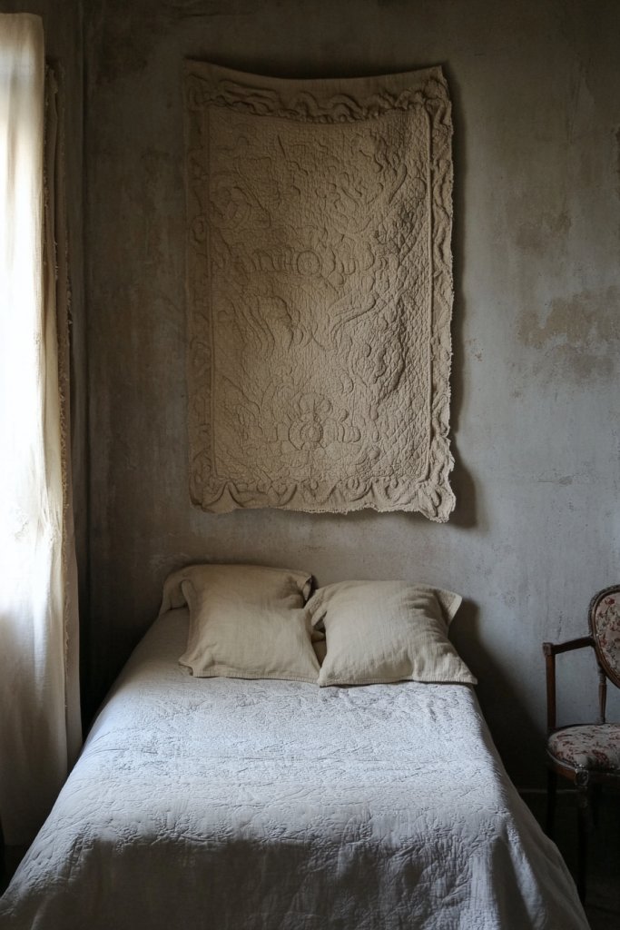Picture a soft, neutral-toned tapestry with a subtle pattern or textured weave hanging behind your bed. Its tactile surface adds depth and coziness, turning a blank wall into a focal point. The fabric’s texture catches the light differently throughout the day, creating a dynamic visual effect. The room instantly feels more layered, inviting, and personalized—like a curated boutique hotel suite.