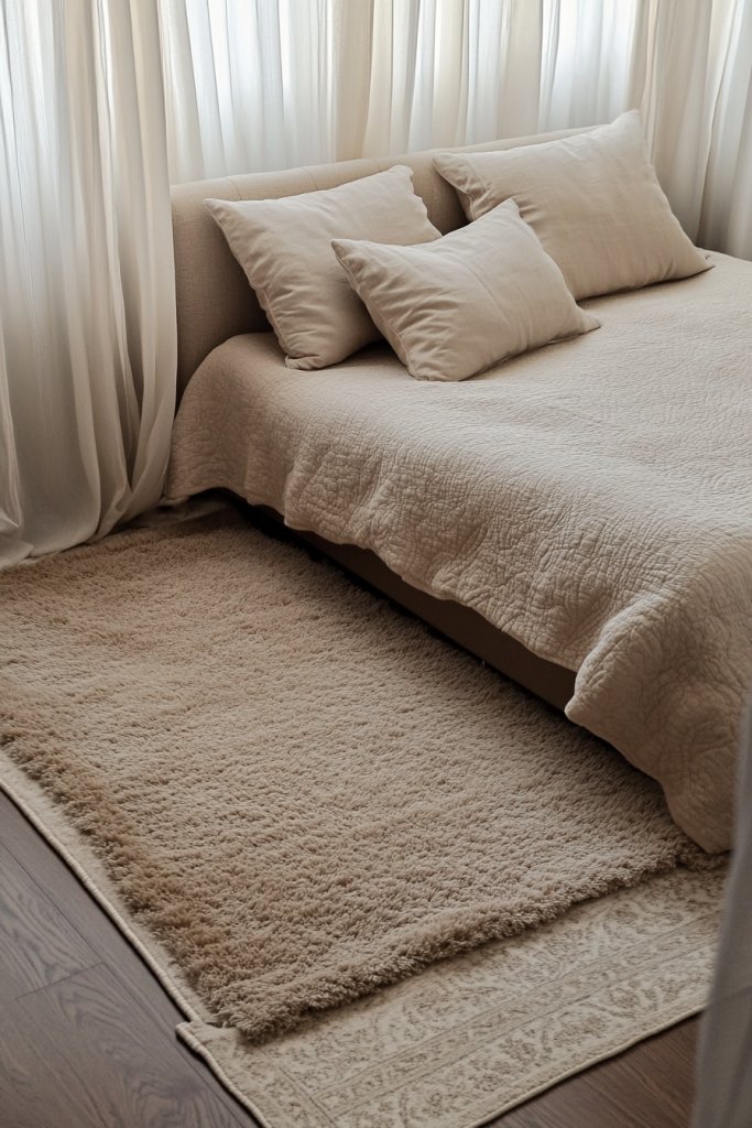 Picture a plush, textured rug in warm beige or muted earth tones spread beneath your bed. Its soft fibers cushion your steps, while intricate patterns or subtle textures add depth to the room’s decor. The rug’s edges softly define the sleeping area, creating a visual boundary that makes the space feel larger. The tactile sensation of walking on a thick, velvety surface invites relaxation and comfort.