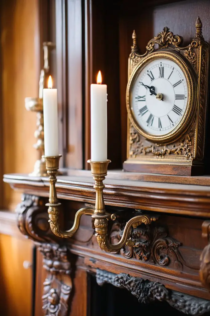 Envision a marble or wood mantel decorated with antique brass candlesticks holding taper candles, a vintage clock with ornate details, and small decorative objects like miniature sculptures or porcelain figurines. The layered arrangement creates visual depth and tells a story of craftsmanship and history. Soft candlelight enhances the vintage vibe, making the space warm and inviting.