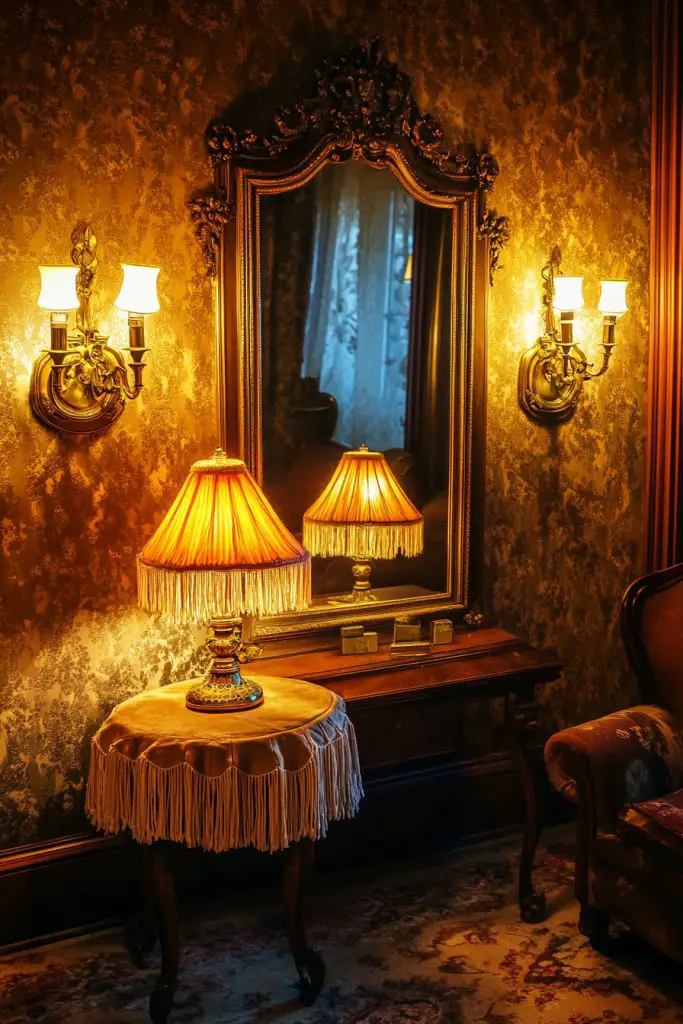 Picture a pair of brass wall sconces with decorative scrollwork flanking a vintage velvet armchair. The soft glow from filament bulbs casts gentle shadows, creating an intimate ambiance. A small, ornate table lamp with a fringed shade sits on a side table, illuminating a Victorian novel or antique vase. The layered lighting enhances the room’s vintage elegance.