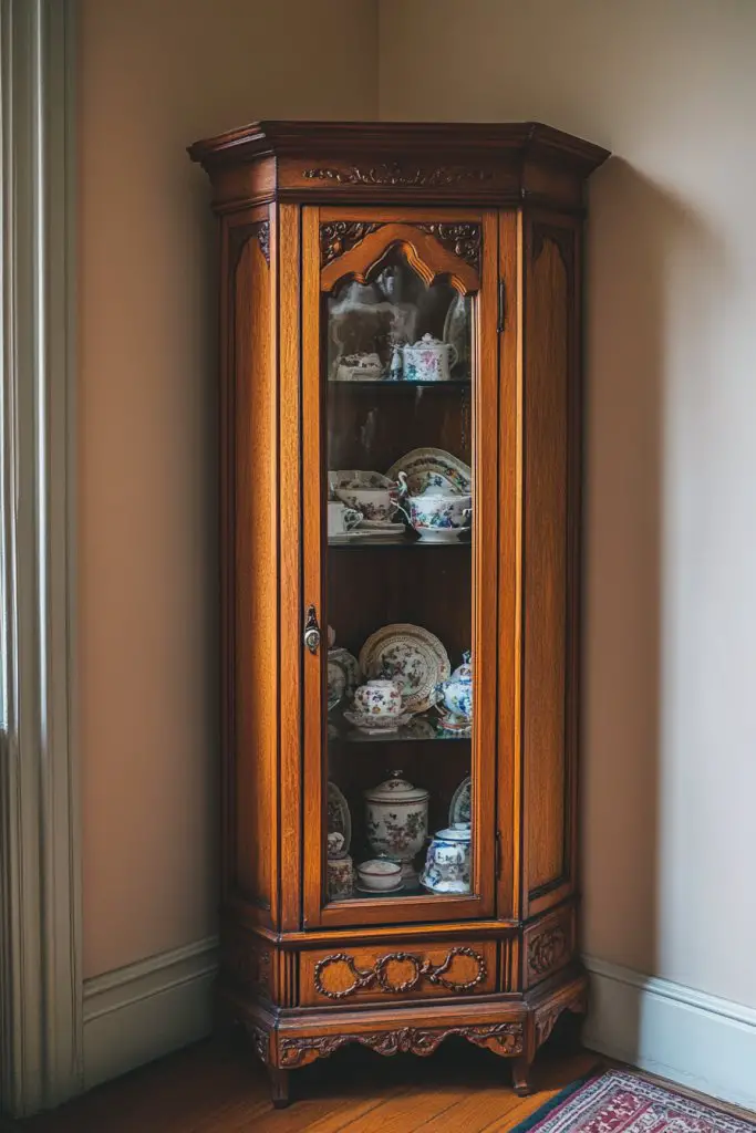 Add Victorian-style hardware or decorative knobs to the cabinet for extra detail. Personalize with framed photos, small sculptures, or textiles that complement your overall decor. Incorporate seasonal or thematic accents to keep the display fresh. Use lighting, like small LED strips, to highlight collectibles.