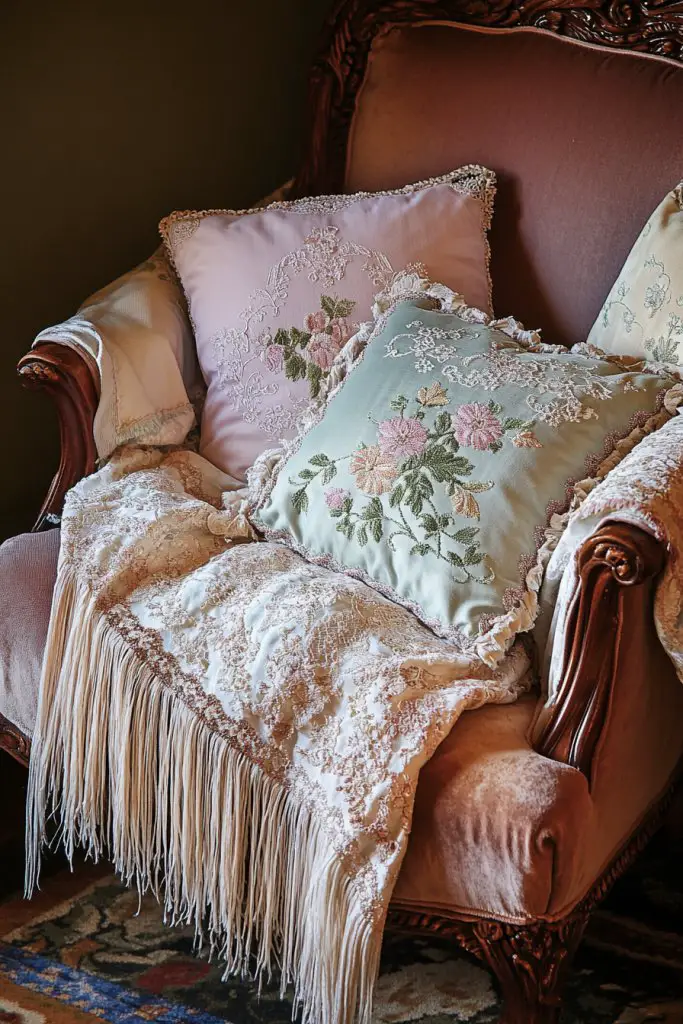 Picture a tapestry of textured cushions in velvet, embroidered brocade, or fringed silk arranged on a vintage armchair or sofa. A soft, fringe-trimmed throw blanket in a complementary hue drapes over the back. These tactile layers invite you to sink in and relax, adding depth and personality to your decor. The rich textures and patterns evoke Victorian refinement.
