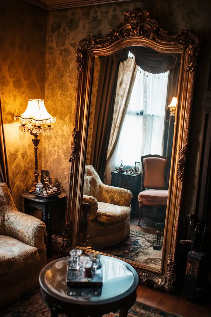Envision placing a large, ornate mirror opposite a window to reflect natural light and expand the room visually. The mirror’s gilded frame echoes Victorian aesthetics, adding elegance. Light from sconces or candles bounces off the mirror, creating a warm glow that fills every corner. The effect is a brighter, more inviting space that feels larger than it is.