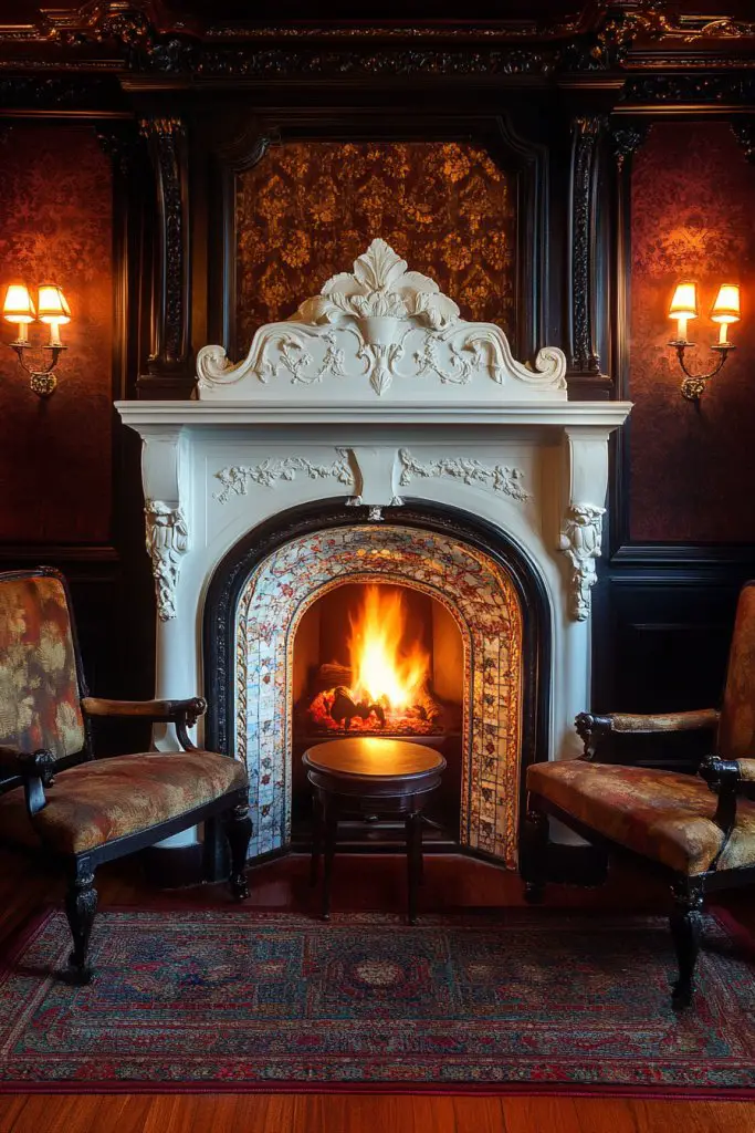 Use decorative tiles or patterned wallpaper behind the fireplace to amplify its visual impact. Add vintage-style fire tools or a small, ornate fire screen for safety and style. Incorporate seasonal touches like faux garlands or ribbons without cluttering the mantle. Personalize with family heirlooms or Victorian collectibles nearby.