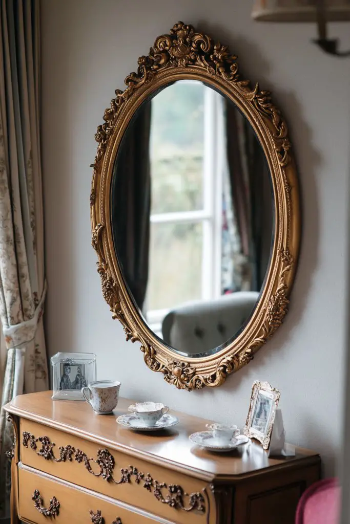 Envision an ornate, gilded mirror with intricate scrollwork and floral motifs hanging above a vintage sideboard. The mirror’s aged patina reflects soft ambient light, bouncing it around the room. Its decorative frame adds a layer of craftsmanship, making the space feel more opulent and layered. The reflection reveals glimpses of your Victorian decor, amplifying the aesthetic.
