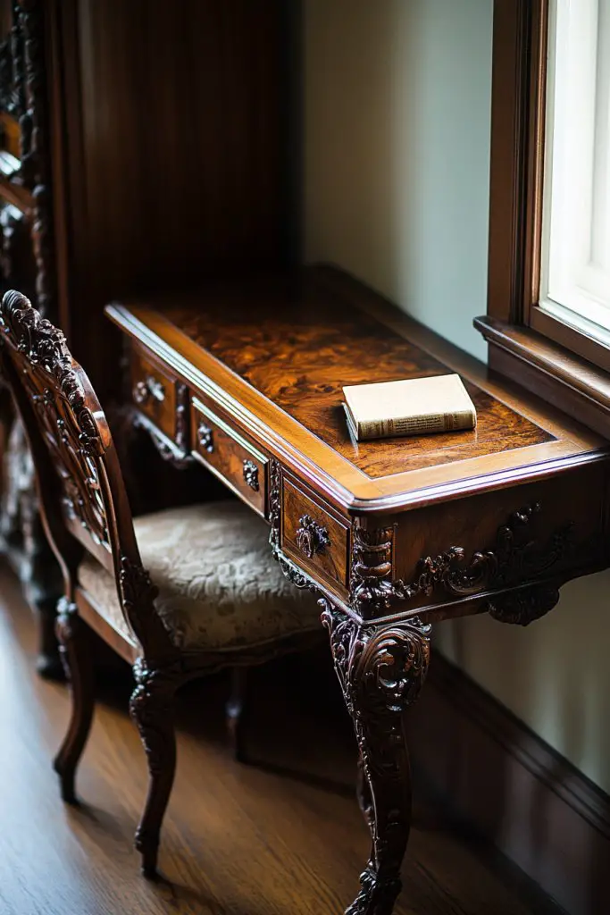 Select a compact desk with carved details that suits your room’s dimensions. Ensure it has enough surface area for your needs but doesn’t dominate the space. Place it near a window or corner to make the most of natural light. Add vintage accessories like ink bottles or quill pens for authenticity. Reinforce the stability of legs and drawers if necessary.