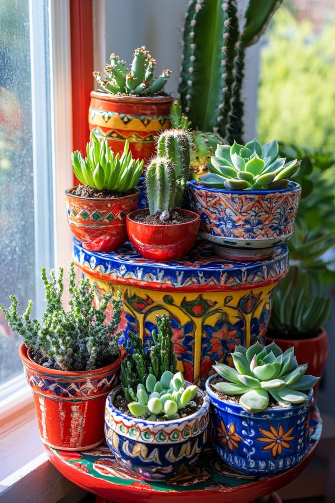 11. Decorate Corners with Potted Cacti and Succulents in Colorful Pots