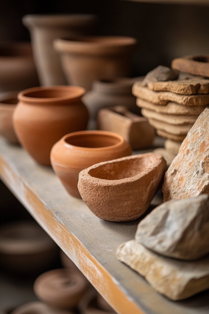Visualize a shelf adorned with clay pots, stone sculptures, or textured decorative objects in warm shades of terracotta, sandstone, and ochre. The surfaces are matte, with natural imperfections that speak to their handcrafted origins. These objects sit alongside regional textiles and carved wood, creating a layered, earthy environment. The overall look is warm, inviting, and connected to the land.