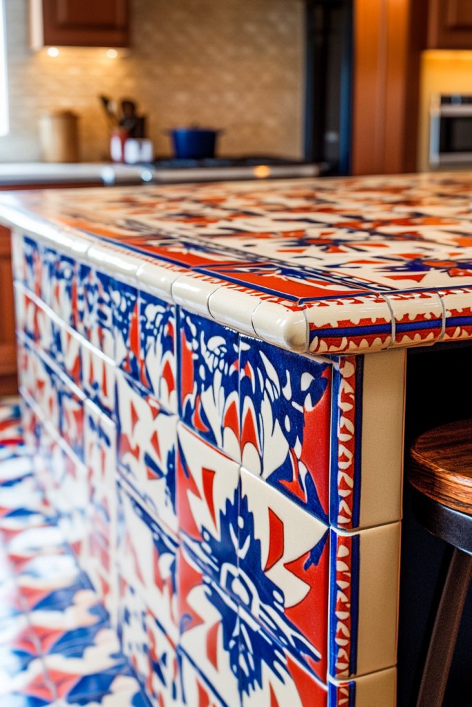 Imagine a kitchen with a vibrant, geometric tile backsplash featuring colors like deep blue, terracotta, and cream. The intricate patterns evoke traditional regional designs, adding a handcrafted touch. The textured surface catches the light, enhancing the depth of the pattern. Complemented by wooden cabinetry and regional pottery, the space feels rooted in desert landscapes and artisan traditions. The overall effect is both lively and authentic.