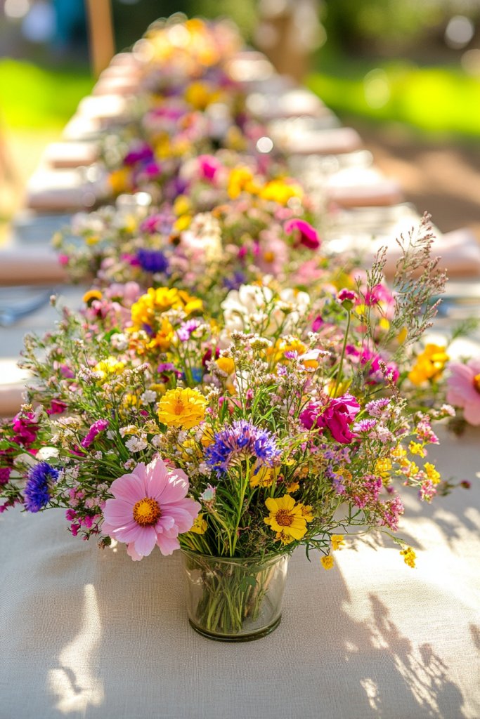 1. Fresh Floral Table Runner with Wildflower Arrangements